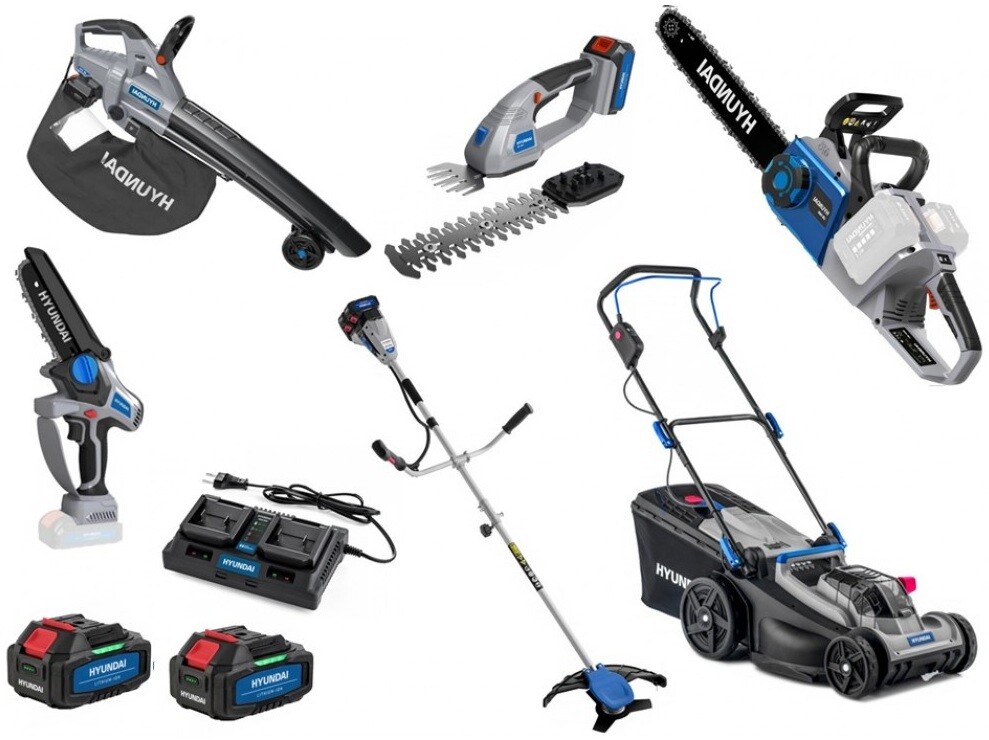 Hyundai Mini - комплекс інструментів для догляду за садом та присадибною ділянкою, що включає шість видів обладнання, що працюють від акумуляторів, що забезпечує мобільність та відсутність дротів. Використовується для обрізання дерев, стрижки газонів та чагарників, а також для видалення листя та сміття на дачі або в приватному будинку.